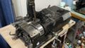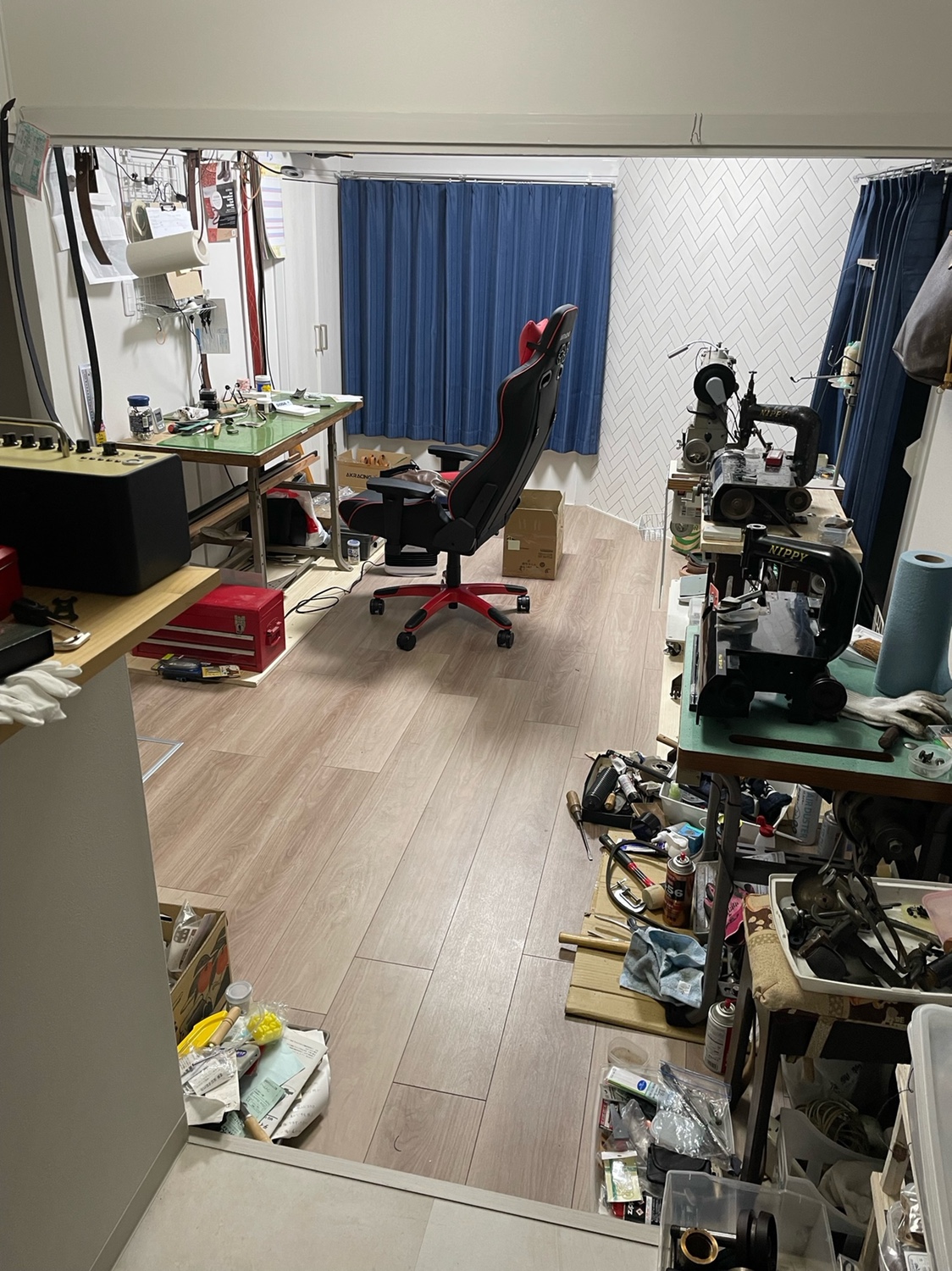 壁にかかってるベルトと、椅子の奥の段ボールと、手前の機械。