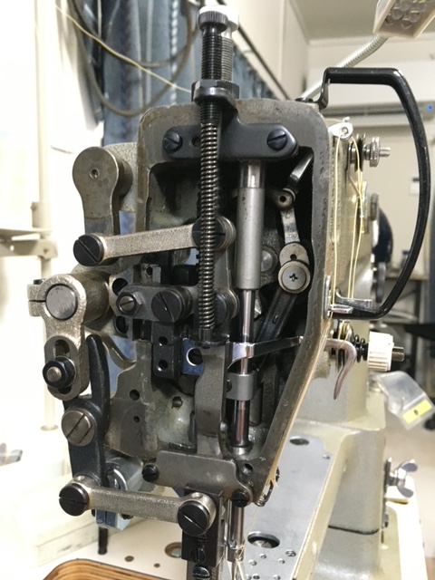 まあとにかく、はずみ車から直接伸びてるシャフトの回転運動から上下運動に変換するというのは100年以上前から変わらない仕組みです。ミシン針の上下のタイミングから絶妙に設定されたタイミングで糸を引き上げてくれる役割の部品、それがてんびん。