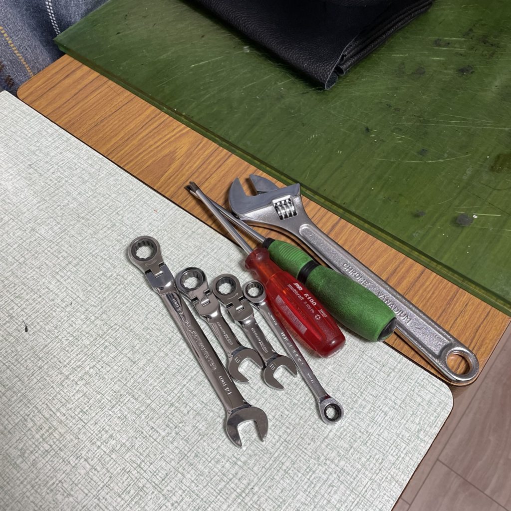 数々の仲間をパーティーに迎え入れ続けた結果、持ち運ぶ武器も洗練されてきました。最初は工具箱ごと持っていかないと不安でしたが、今はこれだけあれば何とかなります。特に13ミリとマイナスドライバーは必須です。1台バラして積み込むのに15分。1本脚はちょっと重たいですが大丈夫、もう何も怖くない(マミさん…)そうだ、過信はいけませんね。初心忘れるべからず。