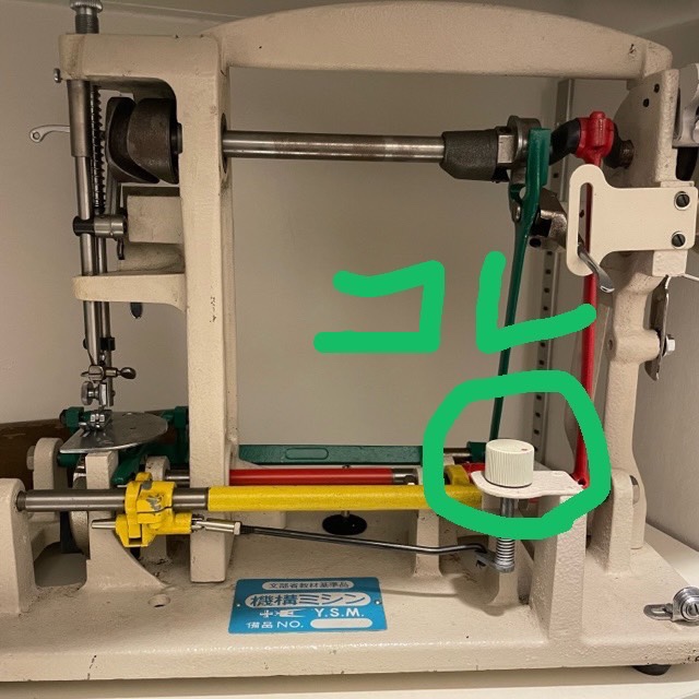 ミシンを裏返すと見える3本のシャフト、手前の黄色いヤツは送り歯の上下運動を司っています。丸で囲んだこのツマミを回すことで送り歯が下がります。