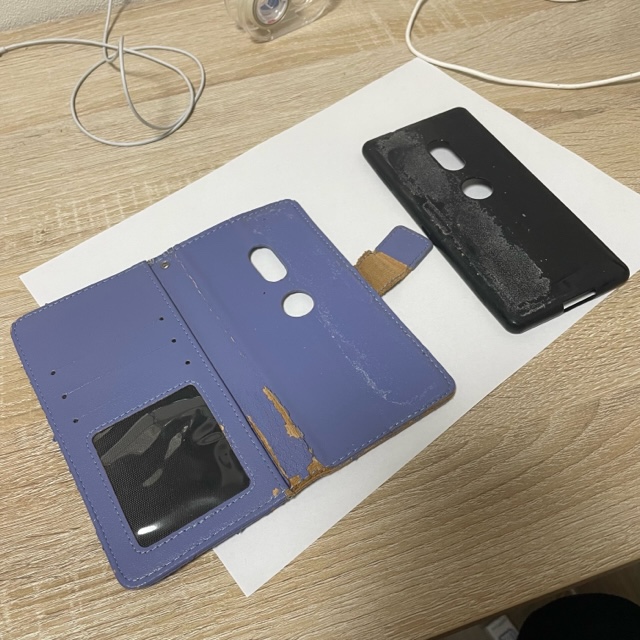 汚ねースマホケース。遠くに住む親から預かったものです。同じ形で作り直してくれ、だと…みんな簡単に言うんです。まるでスイッチポンで出来上がる感覚で言ってきます笑