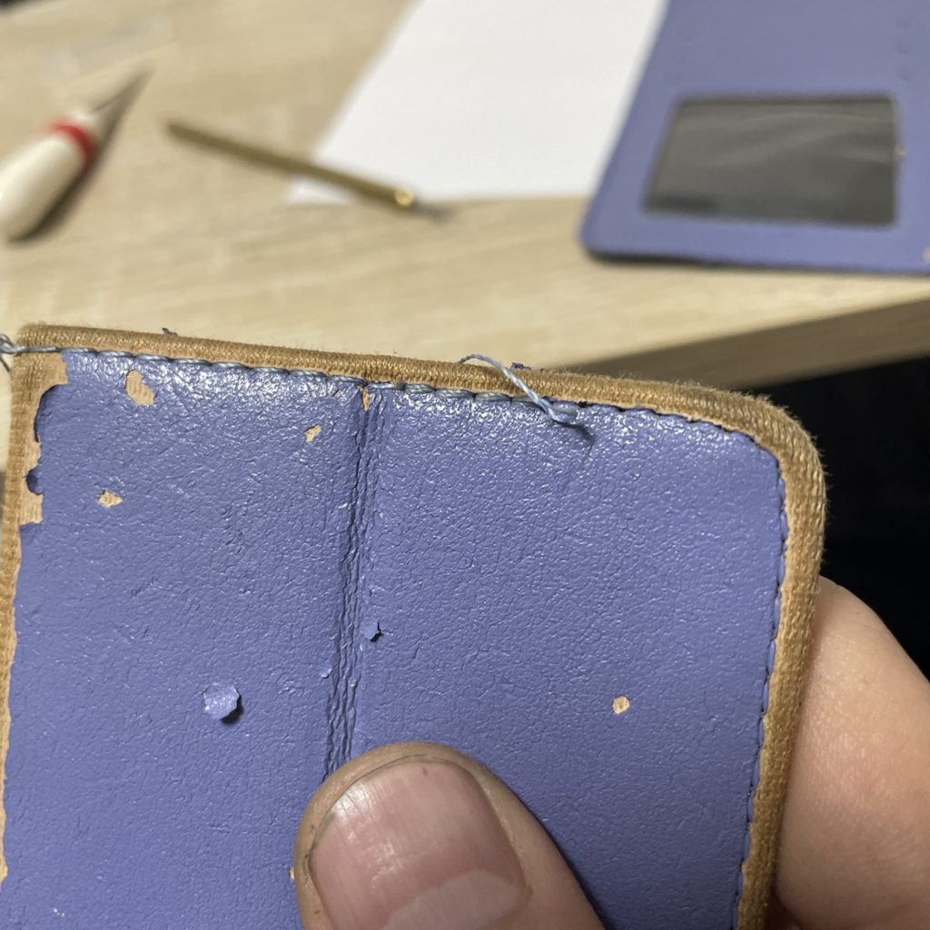 ぐるっと縫う場合は、始めも終わりも返し縫いをせず、ちょっと重ねて終わりというパターンが多いです。それにしても汚ねぇケース。