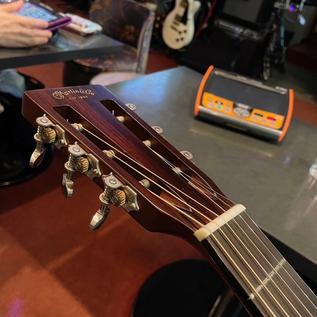 上品なお顔だち、高そうなペグがついてます。クラシックギターみたいなこれはスロッテッドヘッドと呼ばれています。弦交換は少し面倒。