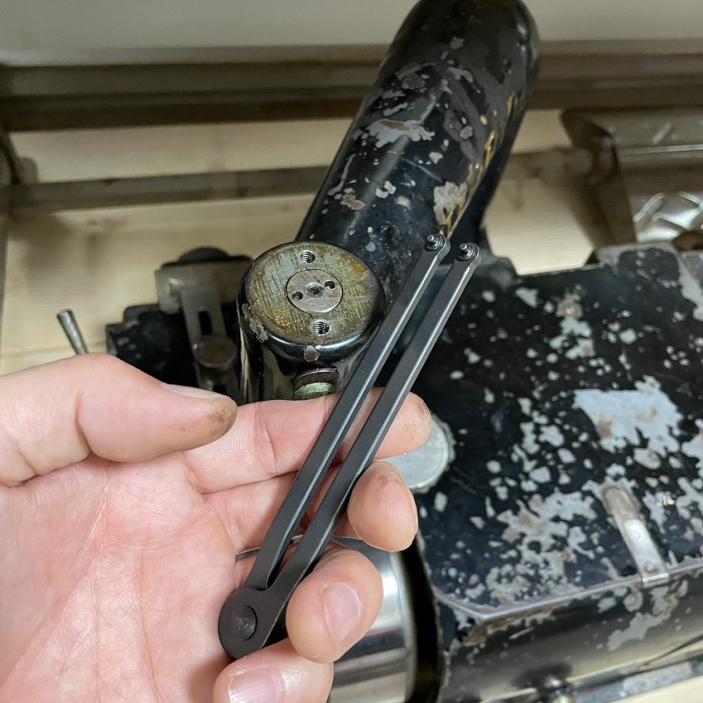 中心のシャフトにバネが入ってて、それを止める蓋がねじ込まれてるんですけど、それを回すためにこんな工具が必要になります。漉き機を新品で買っても付属しない工具です。つまりオフィスのコピー機で言うところの「サービスマンにお任せください」的な。そんな部分なのです。