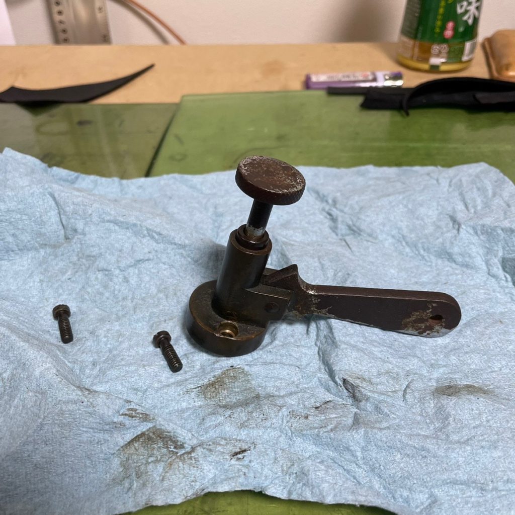 レバーでガバッと上げた押さえを保持するために筒の中にはバネが仕込まれてます。更にそのバネを保持する足場の役割をしているのがこのネジです。