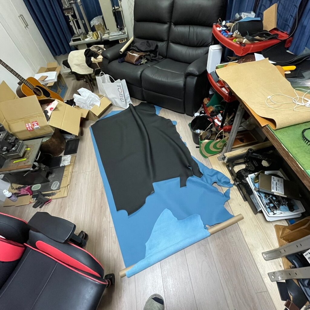 というわけでこちらleather&musicでお馴染みWildroseのブログです。散らかった部屋ですみません。厚みを決めるのに悩んでて、薄くする加工に出していた革がようやく戻ってきたんです。