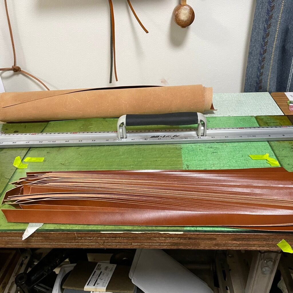 帯状の革をひたすら切るだけの簡単なお仕事。たった124本ですよ!チョロいぜ〜!ぜ〜…ぜ〜…ウソです、疲れたぜ〜。