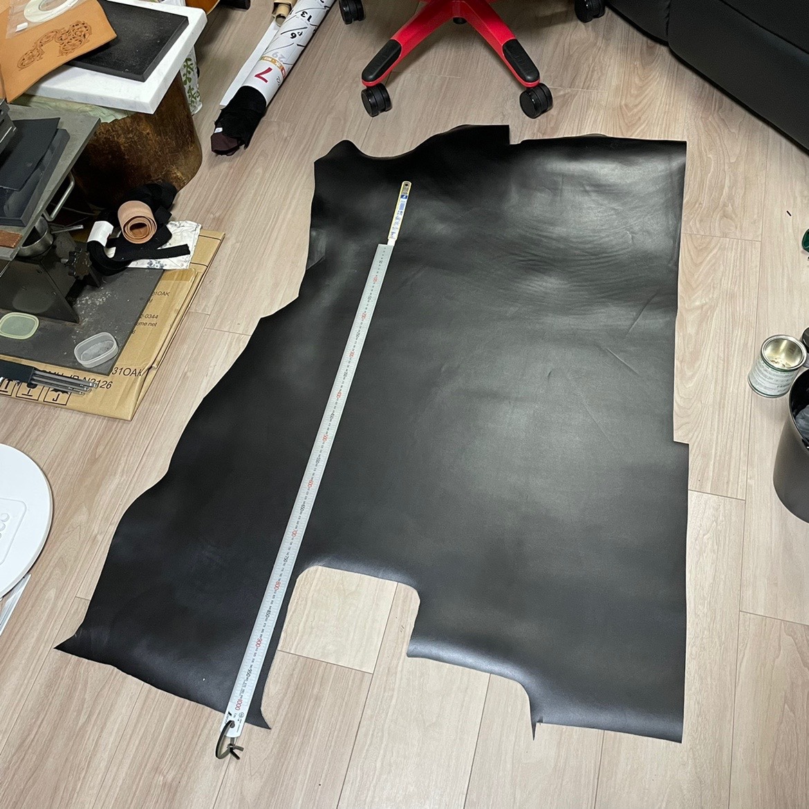 この写真では右の方と下の方で1/3くらい切り取られてますけど、革細工やってる方なら半裁じゃなく丸革だという事に気付くはず。そして定規の感じから、1枚で200DSくらいかな〜、みたいな。そう思った貴方、ビンゴです。