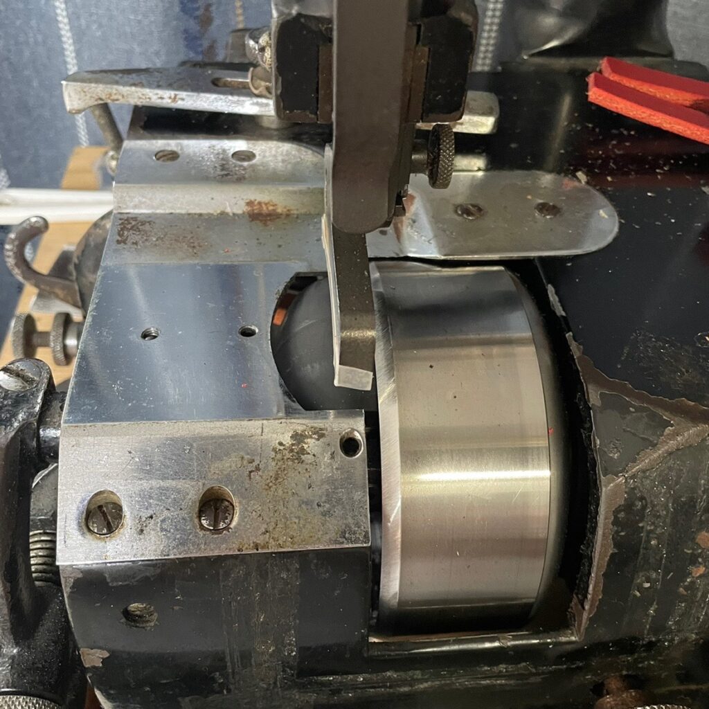 そして漉いた後も厚い状態(厚い設定)にするなら丸刃も右に動かします、押さえから離すということです。(コレは刃が新しいので離す余地が少ないんですけど…)