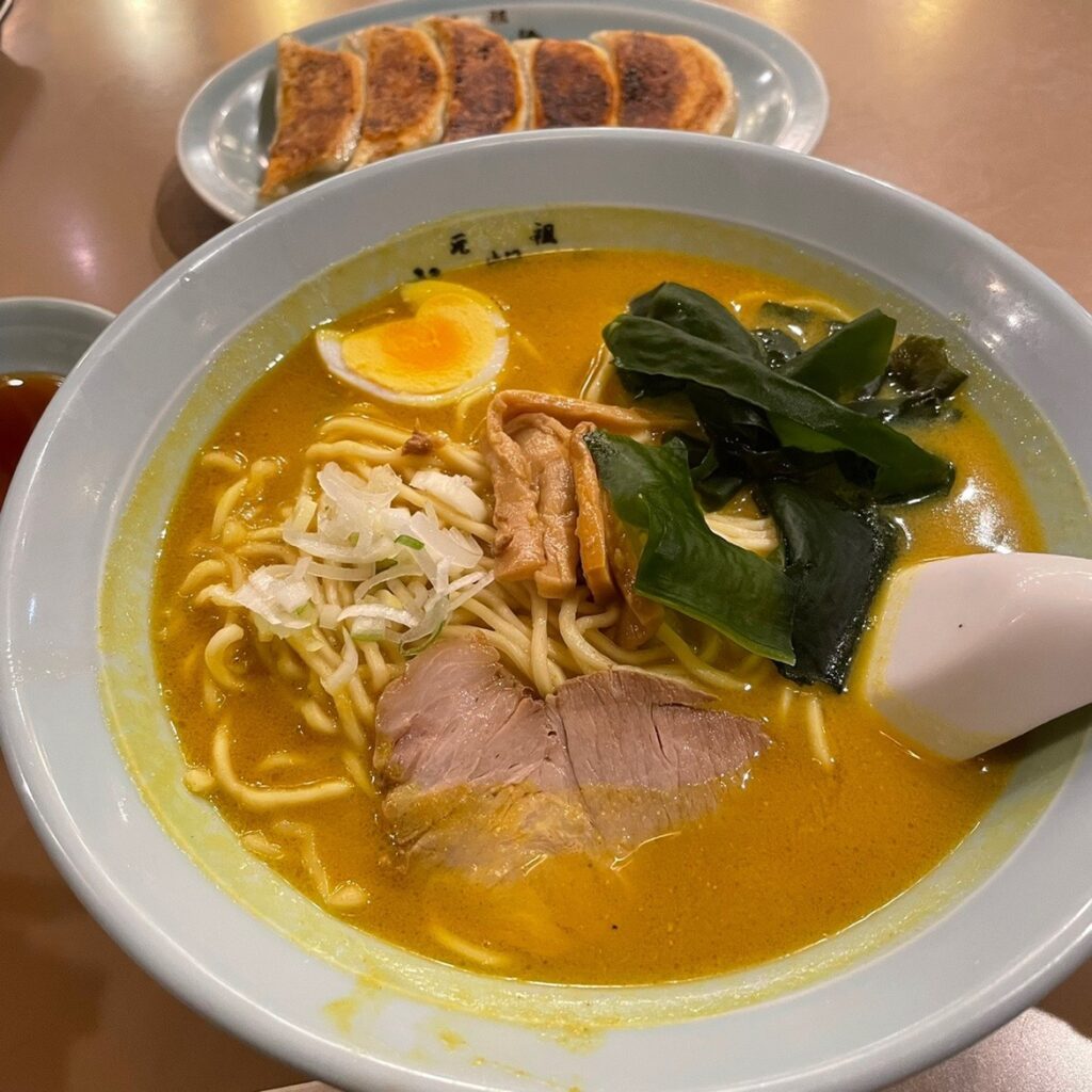 昼から宴会するおばちゃんが集う味噌ラーメンの店。寒いから味噌カレーラーメンと餃子です。初めて食べたけど好きになりかけてます。