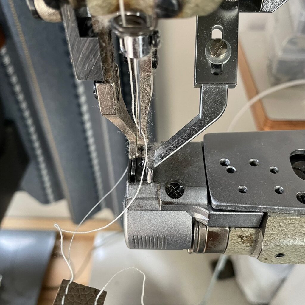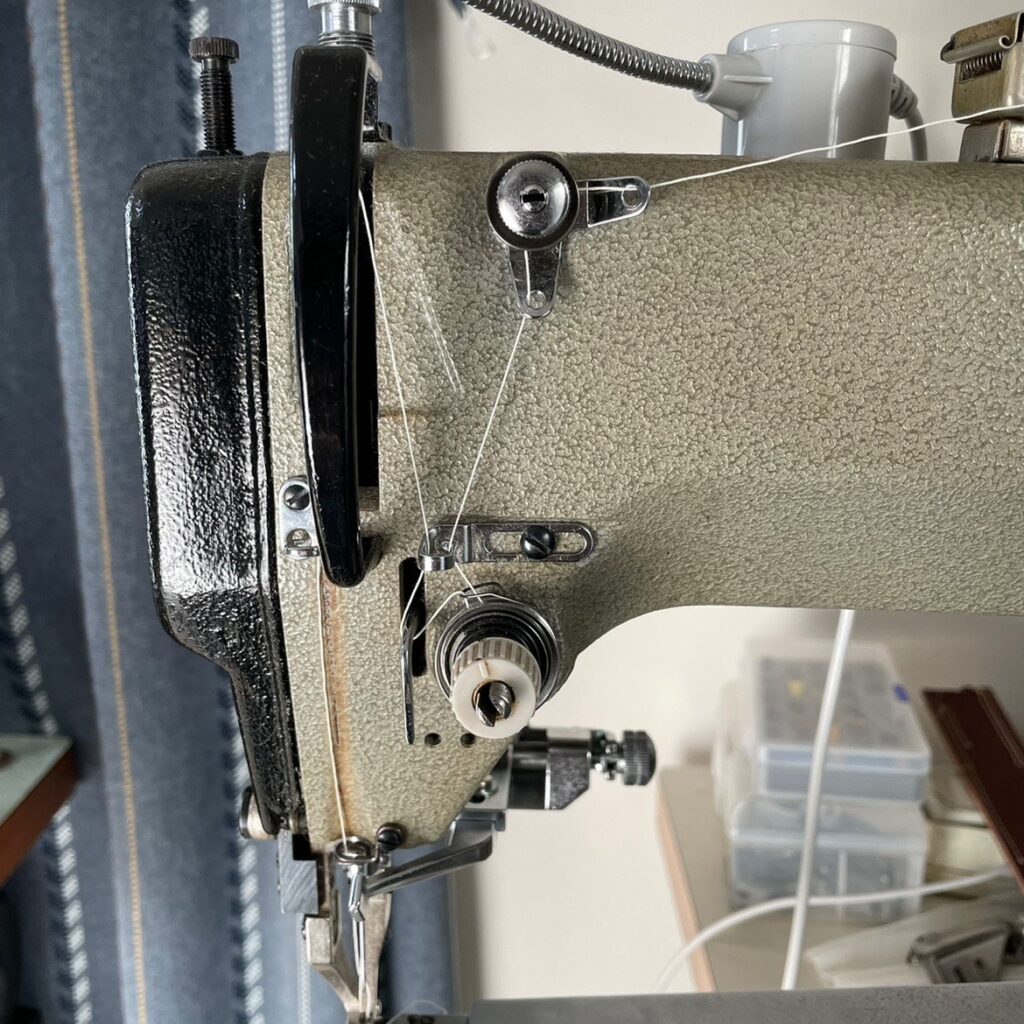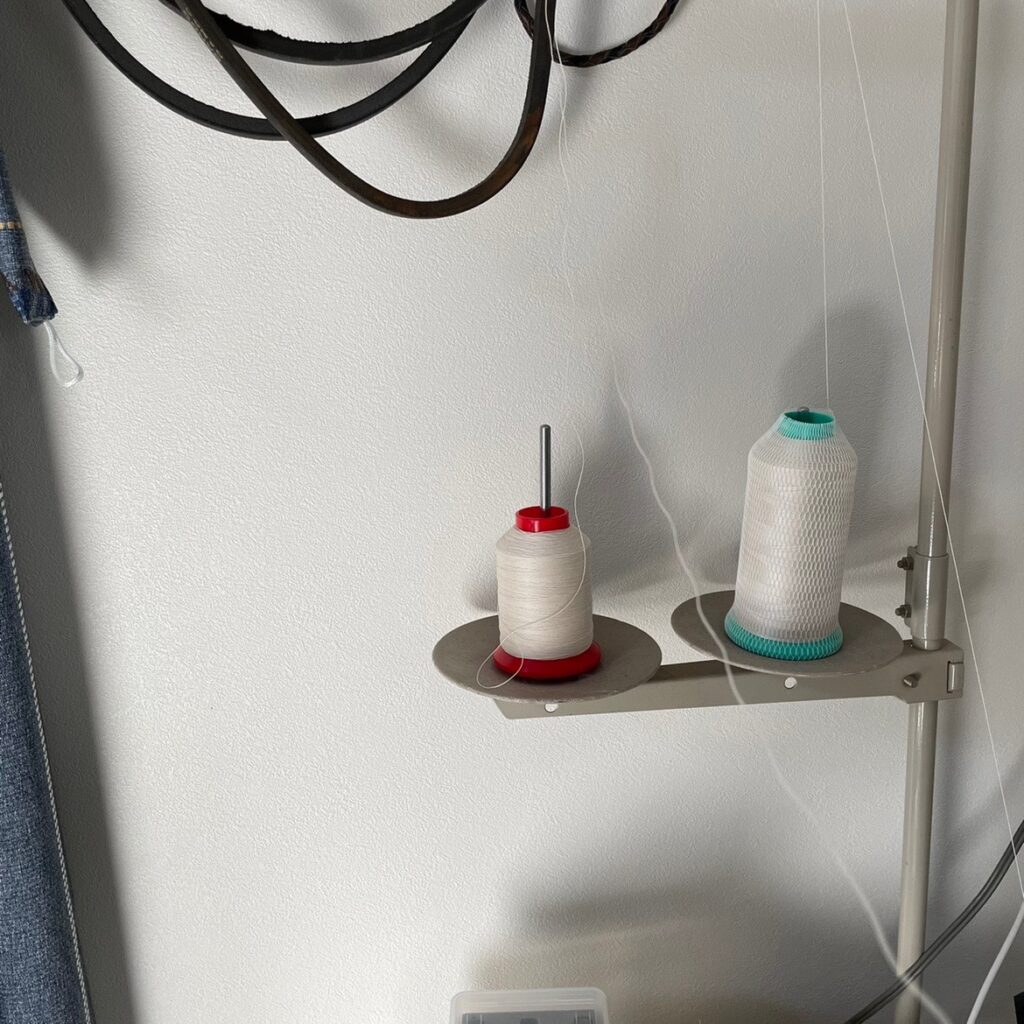 少しでもテンションかけたい時の糸の掛け方はこう。くの字に曲げることで抵抗アップ、からの糸調子皿を全部使えます。でもこれはミシンの限界値に近い所を使ってるのであまりやりたくないのです。隣にはサブ機の総合送り君が居るので、そっちの方がたぶん楽に使えるんでしょうけど…でもやっぱりこっち使っちゃうんだよね…
