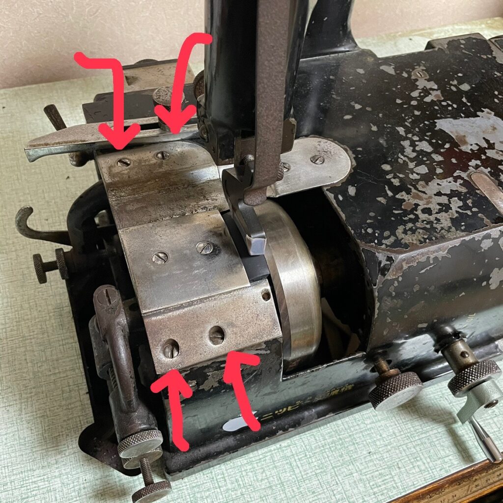 まずは矢印のネジ4個外しましょう。あと、刃を「目いっぱい離す」ようにしてください。この後の作業に差し支えるので。押さえも定規も外しておいてね。