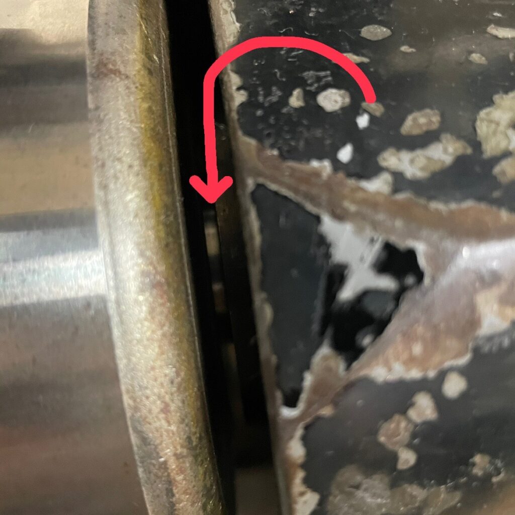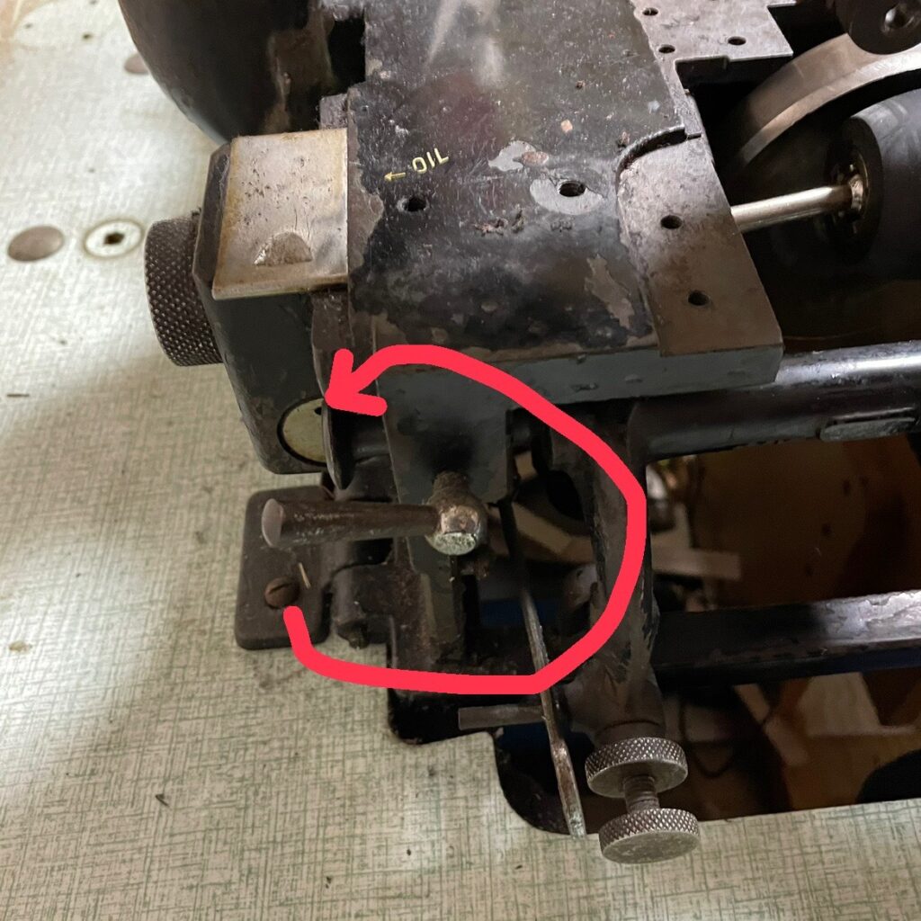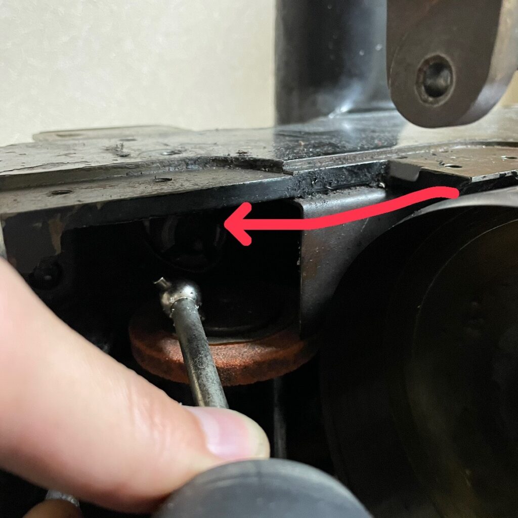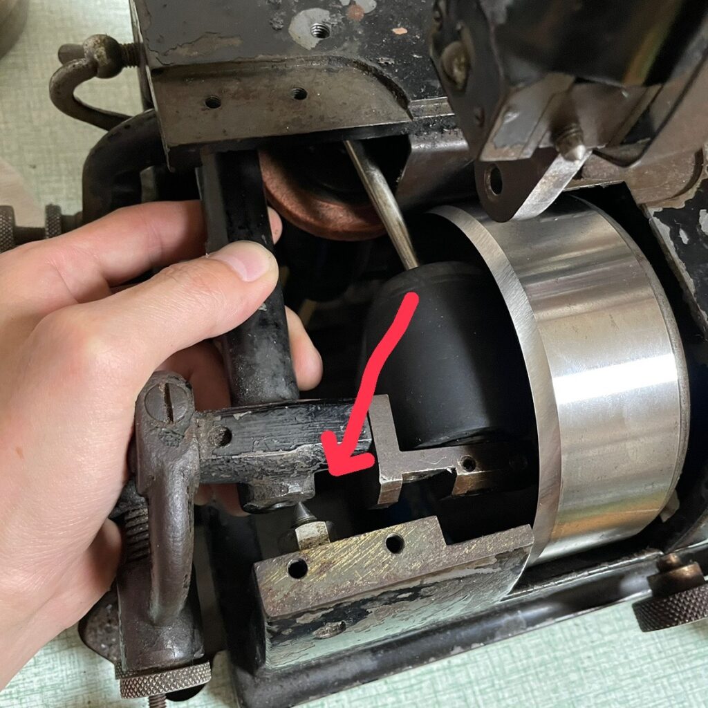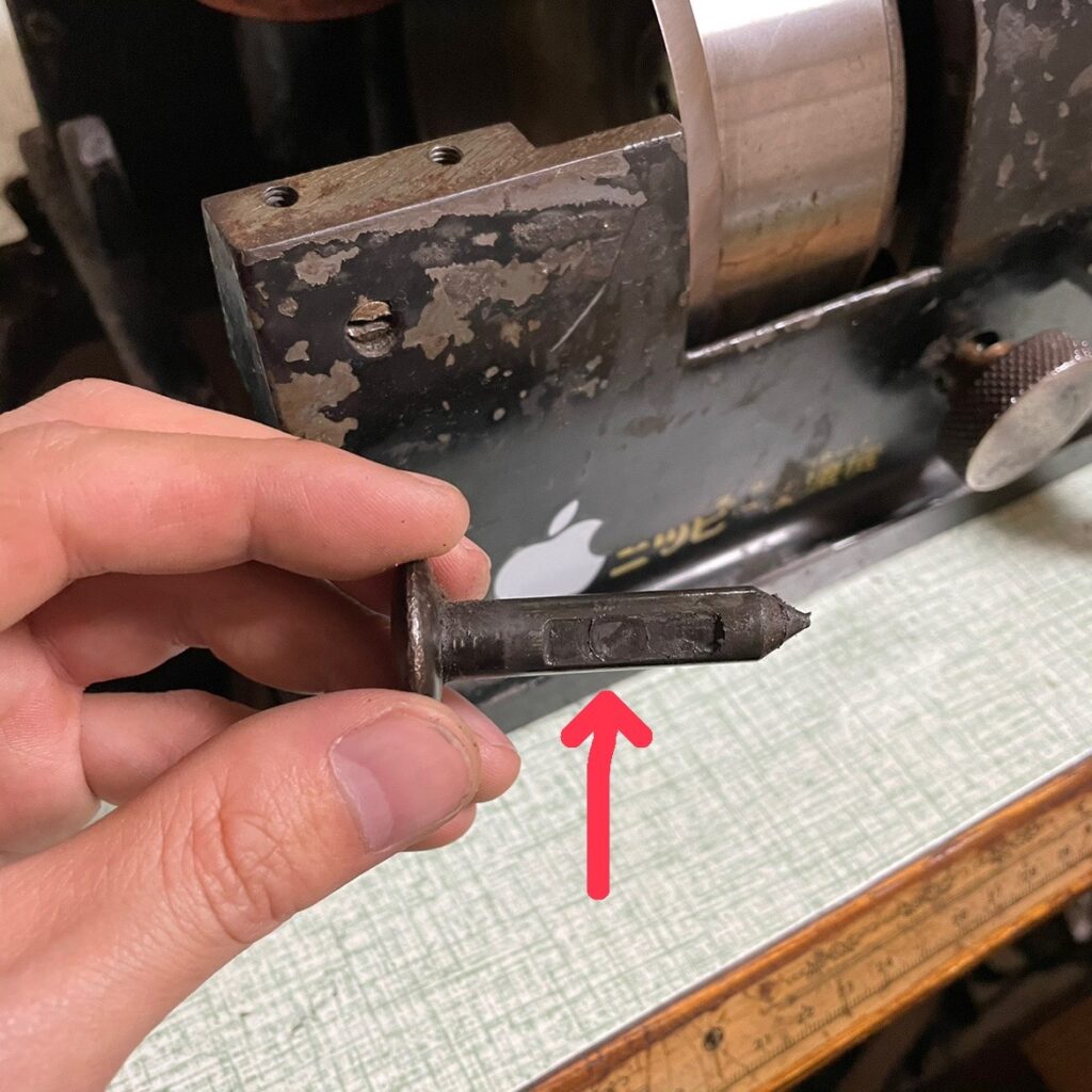 ちなみに奥のピンはこんな感じになっていて、矢印の平らな場所にレバーのネジが当たるという仕組みです。