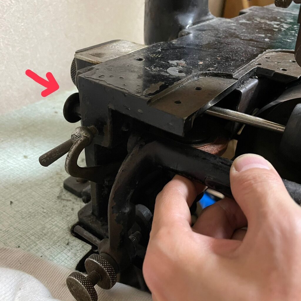 このピンを矢印の方向へグイッと押しながら、最初に緩めたレバーを締める。