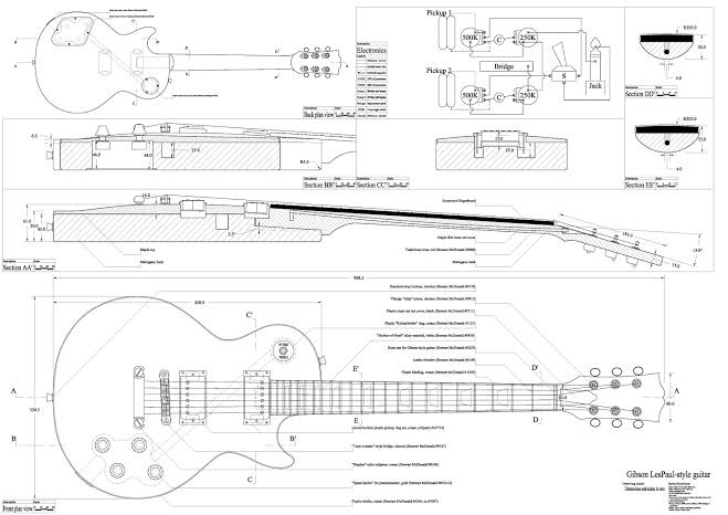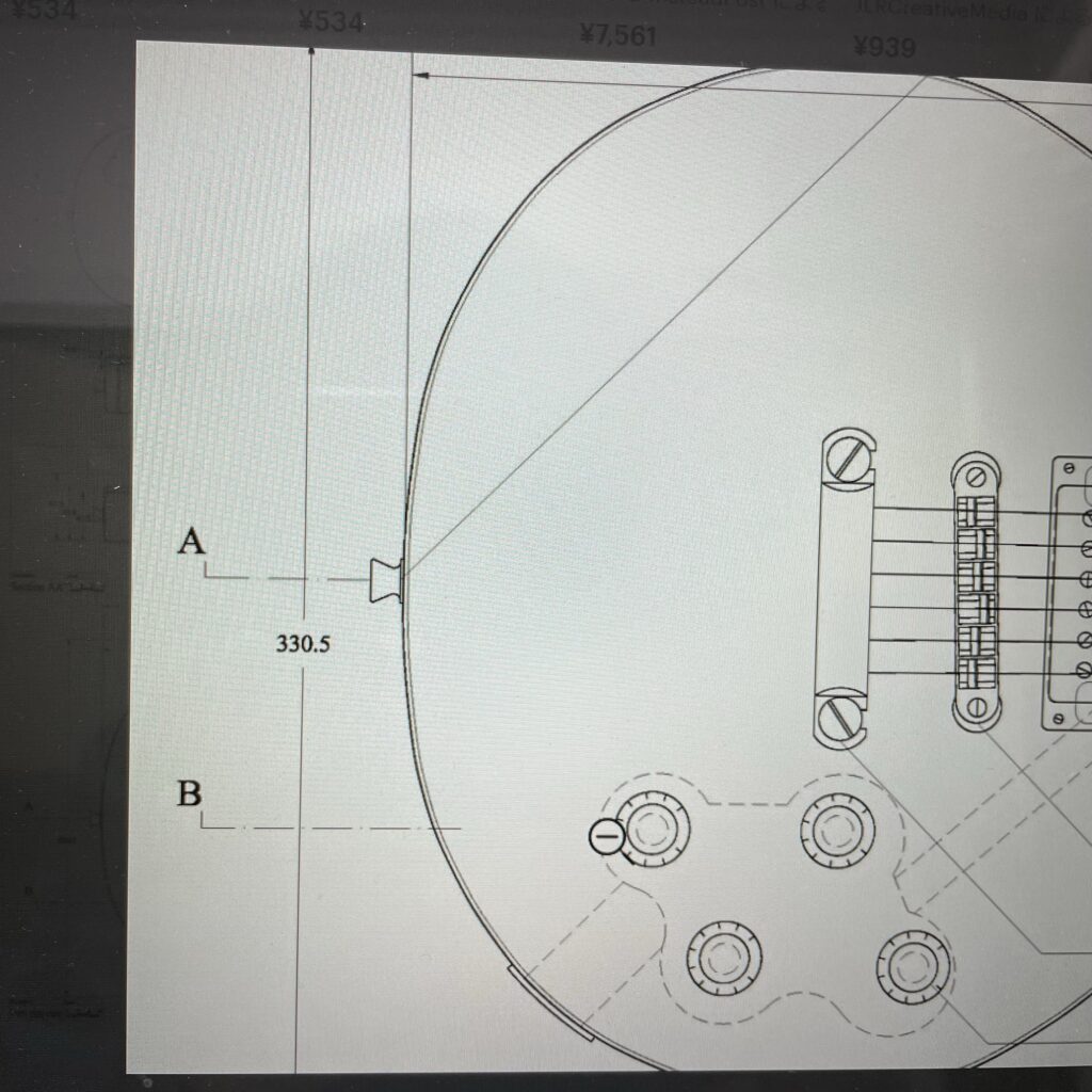 うーん…私は0(シングルオー)だと踏んでるので、ボディの幅は13.5インチ、34.2センチくらい。では隣のレスポールのサイズはっと…