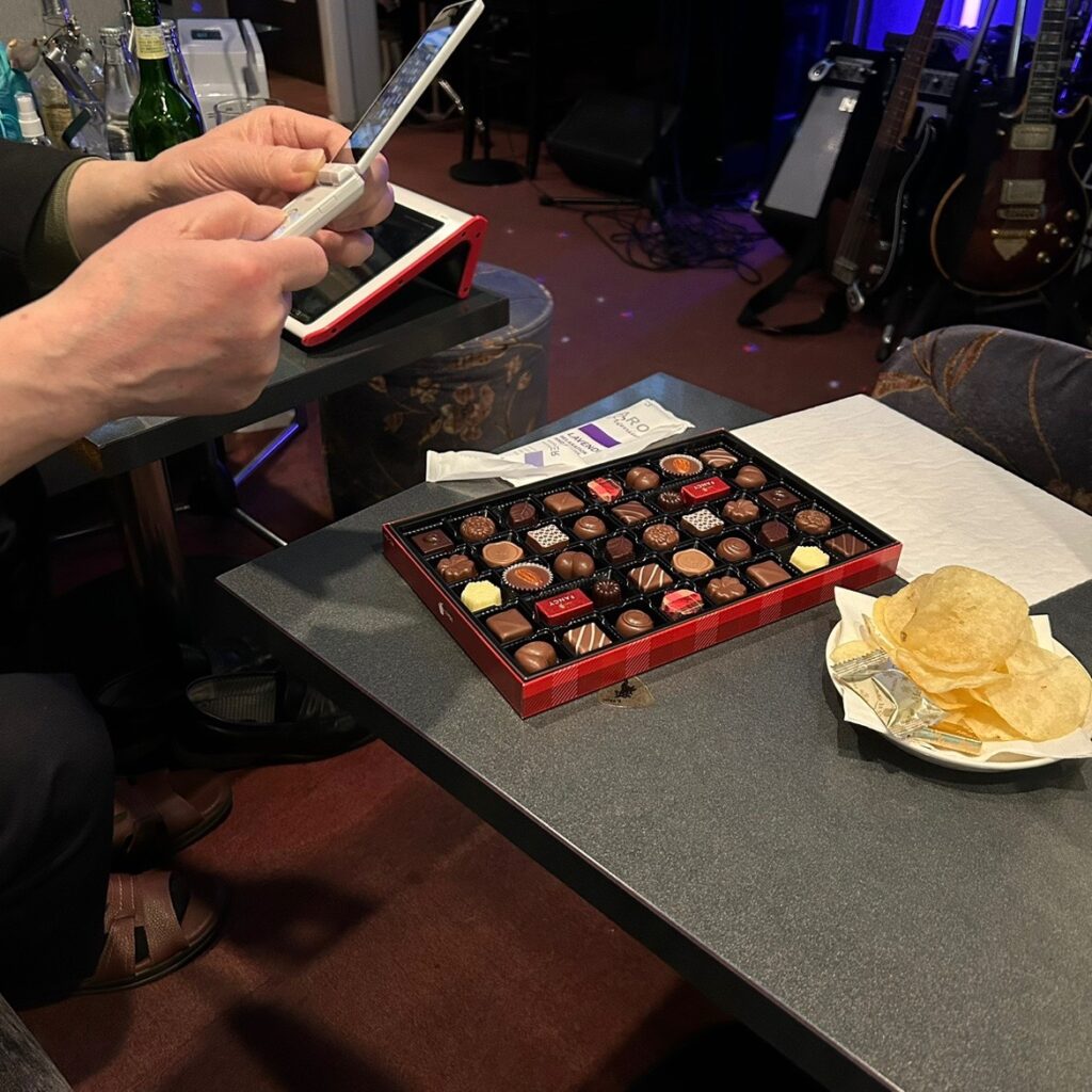 ギターよりチョコの撮影に夢中なオジさん2人でお出迎えします。