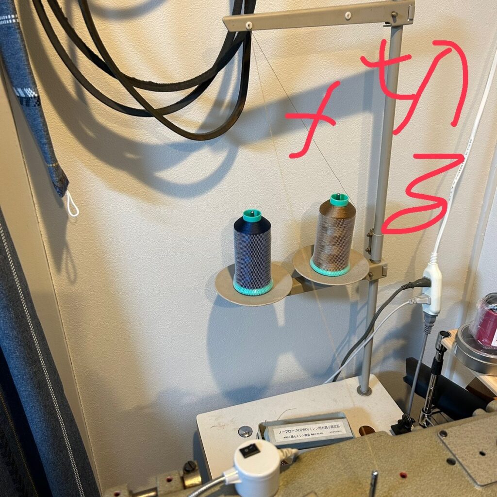 さてニンニクの余韻に浸りながら上糸を替えましょう。今かかってる糸を切って隣の青いのに結べは早いのですけど1メートルほど無駄に捨てるので躊躇する人も居るとか居ないとか、イヤそこはケチんなよって…ていうか「ちゅうちょ」と「ためらう」って同じ漢字なんすね。