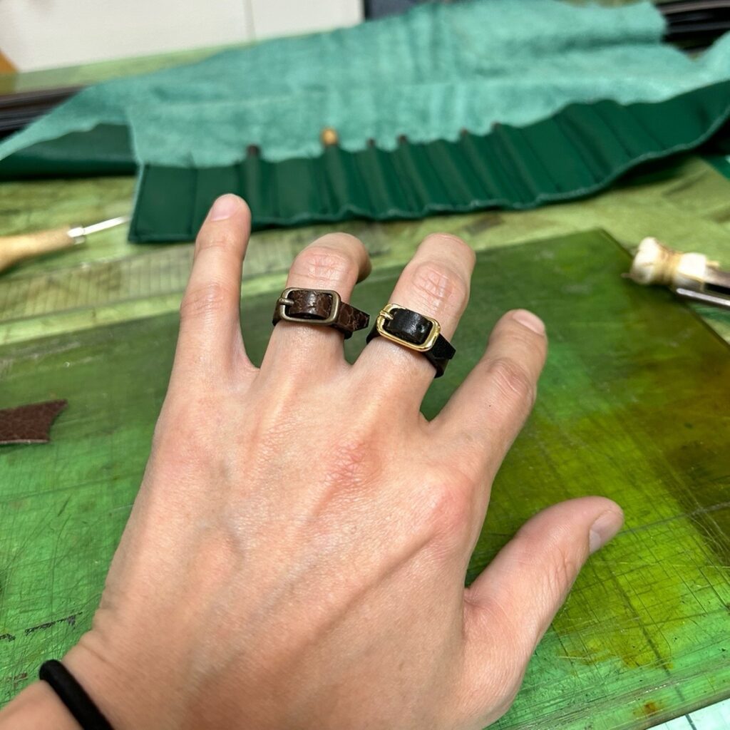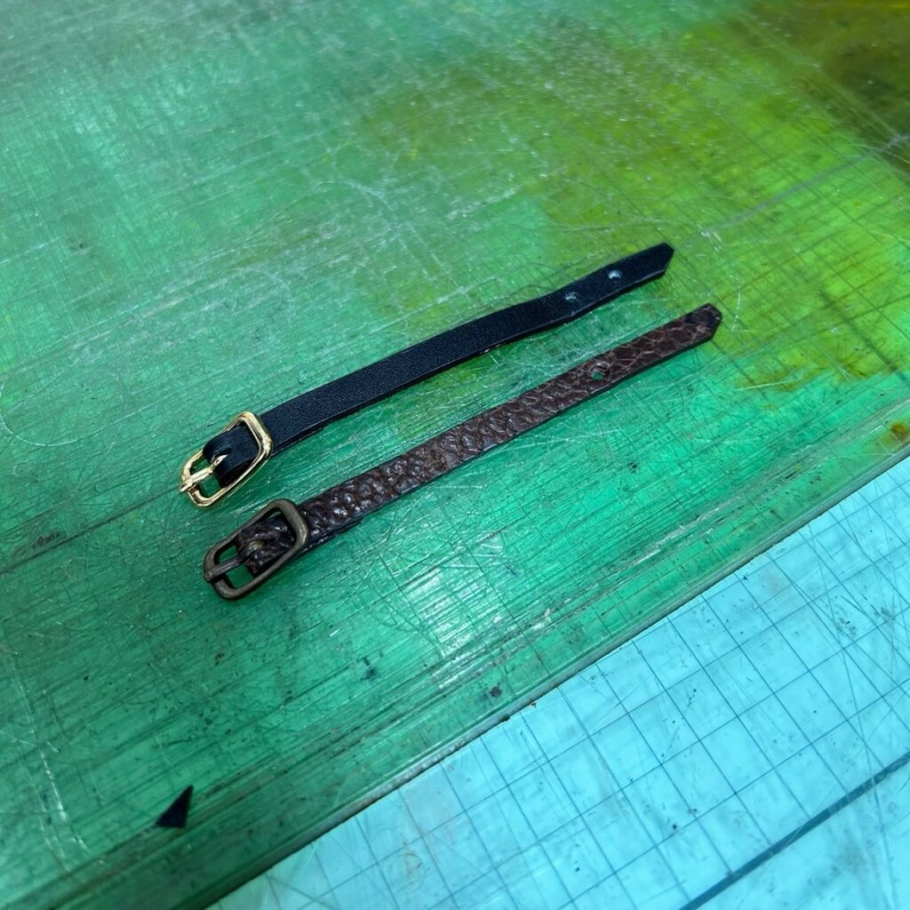 遠く北海道から空輸されてきた熊の革(右の方)でベルトが出来たよ